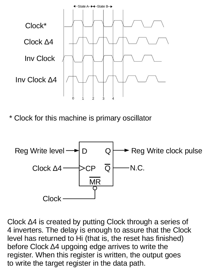 The details of the logic circuit that produces the control signals, the register clock pulse machine, and the write signal machine, can be seen in the control board schematic.